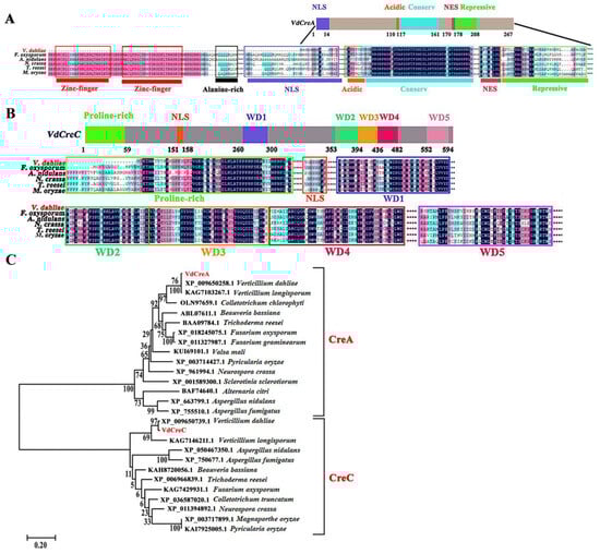 Phylogenetic analysis based on amino acid sequences revealed that VdCreA and VdCreC were classified into two different clades, and they clustered with homologs of CreA and CreC from other fungi, respectively, which is consistent with their amino acid sequence similarity. This suggests that CreA and CreC in filamentous fungi were highly conserved during their evolution (Figure 1C).