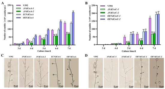 The effect of VdCreA and VdCreC knockout on conidial production. (A) Conidia produced by the V592 strain, ΔVdCreA, ECVdCreA, and OEVdCreA. (B) Conidia produced by the V592 strain, ΔVdCreC, and OEVdCreC. (C) Microscopic observation of conidiophore stalks produced by the V592 strain, ΔVdCreA, ECVdCreA, and OEVdCreA. (D) Microscopic observation of conidiophore stalks produced by the V592 strain, ΔVdCreC, and OEVdCreC. Error bars represent the standard deviation. ** represents a significant difference at the 0.01 probability level between the knockout mutants, the complementary strain, the overexpression strains, and the wild-type strain V592 (p < 0.01).