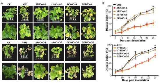 2.3. VdCreA and VdCreC Are Involved in Pathogenicity