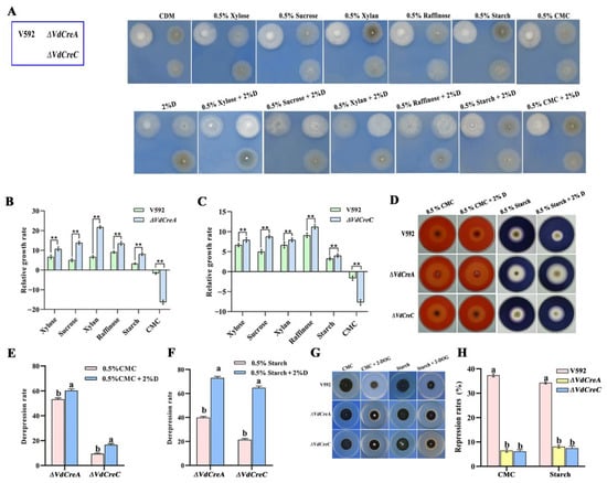 To further investigate the role of VdCreA and VdCreC in CCR, 2-deoxy-d-glucose (2-DOG) was used as a repressing carbon substrate to assess the glucose-induced repression through measuring the colony growth of the V592 strain and the two mutants grown on Czapek–Dox medium containing CMC plus 2-DOG, and starch plus 2-DOG. 2-DOG is a non-metabolizable D-glucose analog and can inhibit glucose metabolism in the cells []. The results showed that the growth repression rate was higher in the wild-type strain V592 than that in the ΔVdCreA and ΔVdCreC (Figure 5G,H). Thus, similar to many other filamentous fungi, VdCreA and VdCreC function as key regulators of CCR in V. dahliae.