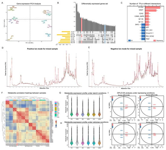 Global statistics of transcriptomic and metabolomic data. (A) PCA of the expression levels of all samples. (B) Up-set diagram of DEGs in differential groups. Red annotations represent differential groups under repressing conditions, while blue annotations represent all differential groups. (C) Statistics of transcription factors in common DEGs under different groups. (D,E) The total ion current of the mixed sample. (F) Heatmap of sample correlation based on metabolite expression levels. Outlier samples are marked in red. (G) Boxplot statistics of dominant metabolites under starch conditions. (H) Boxplot statistics of dominant metabolites under cellulose conditions. (I) OPLS-DA mode diagram of different groups under repressing conditions.