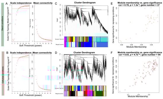 WGCNA analysis in starch and cellulose conditions. (A,B) Soft-thresholding selection diagram. The red horizontal line represents a threshold of 75%. (C,D) Gene tree, module division, and merging results. (E,F) Scatter plot of module correlation with repressing conditions.