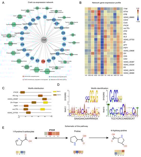 VdCreA may target the regulation of PYCR expression, affecting the normal growth of the strain. (A) Co-expression network related to the VdCreA gene. The circular nodes represent genes, and the color of the circles represents the expression trend of the gene. Hexagonal nodes represent the pathways enriched with metabolites in the network. (B) Expression heatmap of genes in the co-expression network: the redder the color, the higher the expression level, and the bluer the color, the lower the expression level. (C) Motif 2 and motif 5 are distributed in the proximal promoters of seven co-expressed genes. (D) The identification of motif 2 and motif 5. (E) The changes in metabolites in the PYCR pathway.