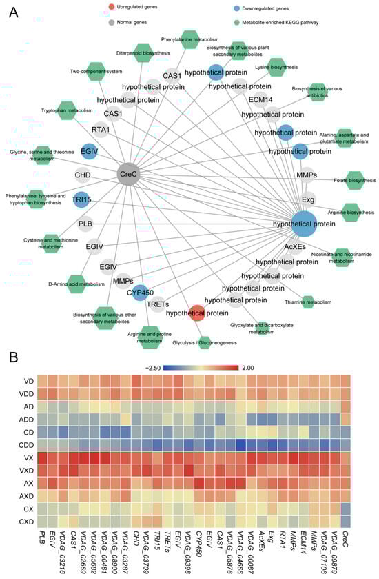 Co-expression network related to repressing conditions. (A) Co-expression network related to the VdCreC gene. The circular nodes represent genes, and the color of the circles represents the expression trend of the gene. Hexagonal nodes represent the pathways enriched with metabolites in the network. (B) Expression heatmap of genes in the co-expression network: the redder the color, the higher the expression level, and the bluer the color, the lower the expression level.