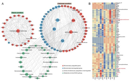 We extracted two modules related to repressing from the WGCNA results and performed KEGG enrichment on the modules’ genes (Figure S6). Among the top 20 enriched pathways, 4 were consistent: carbon metabolism, pentose phosphate pathway, arachidonic acid metabolism, and glutathione metabolism. Further, a similar process was used to construct the co-expression network of genes and metabolites within the module, with genes involved in carbon metabolism serving as hub genes (Figure 10A). Under starch conditions, the hub gene encoded a 6-phosphogluconolactonase, which is one of the core roles in the pentose phosphate pathway, and it was always upregulated after repression in all samples. There were 22 co-expressed genes with the hub gene, of which 21 were only upregulated, and 1 PG (polygalacturonase)-encoding gene was only downregulated. Under cellulose conditions, among the five hub genes, the genes encoding G6PD (glucose-6-phosphate 1-dehydrogenase) and glyoxylate reductase were always upregulated. G6PD is the rate-limiting enzyme of the pentose phosphate pathway, and glyoxylate reductase is involved in the synthesis of succinate in the glyoxylate cycle. One PrpC (2-methylcitrate synthase), one MCL (mitochondrial 2-methylisocitrate lyase), and one 2-OGDH (2-oxoglutarate dehydrogenase E1) were always downregulated under repressing conditions. These three genes encode key enzymes in the citric acid cycle. There were 47 genes co-expressed with the hub genes, of which 25 genes were always upregulated, 21 genes were always downregulated, and 1 DAAO (D-amino acid oxidase) gene had opposite expression trends in different groups. Surprisingly, although the two gene expression networks were markedly distinct, the gene functions in the two modules overlapped and their strongly correlated metabolites were basically the same, suggesting that the strain may complete CCR through similar pathways. The genes in the two co-expression networks were strongly correlated with as many as 685 metabolites. Enrichment analysis showed that these metabolites were widely involved in lipid metabolism, nucleotide metabolism, amino acid metabolism, carbohydrate metabolism, etc., indicating that CCR could systematically affect the activity and efficiency of various biochemical processes. These metabolites were mainly enriched in carboxylic acids and derivatives (14 metabolites), organooxygen compounds (12 metabolites), prenol lipids (10 metabolites), and benzene and substituted derivatives (10 metabolites). Regardless of which module’s co-expressed genes had different preferences for carbon sources, according to the expression profile, they can generally be divided into two categories (Figure 10B). One category contains most genes, such as 6-phosphogluconolactonase, PrpC, G6PD, 2-OGDH, and glyoxylate reductase, etc. Once the strain was in repressing conditions, regardless of the carbon source or strain, its expression level would stably increase or decrease. The difference was that some of them had higher expression in starch, and others had higher expression in cellulose. These genes may participate in the CCR process regardless of the carbon source. However, some other genes were only induced in one carbon source, such as MCL, which had almost no expression under starch conditions and was downregulated by repressing induction under cellulose conditions. PG was only downregulated under starch conditions. Whether they participated in CCR was related to the carbon source faced by the strain. The subtle differences in expression patterns between these co-expressed genes may be the handle for the strain to fine-tune CCR to efficiently utilize carbon sources. The core genes functioned as hub nodes within the expression network, offering a leverage point for further analysis of CCR.