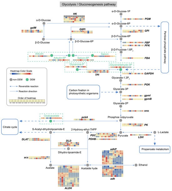Analysis of the glycolysis/gluconeogenesis metabolic pathway. Circles represent metabolites, gray circles represent non-DEMs, green circles represent DEMs, which are highlighted in the dashed rectangular box for emphasis. Arrows indicate the direction of reaction, and the genes encoding the enzymes catalyzing the reaction are displayed at the corresponding positions. The dashed arrows indicate connections to other related metabolic pathways. The heatmap represents the expression level of genes or metabolites.