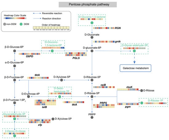 Analysis of the pentose phosphate metabolic pathway. Circles represent metabolites, gray circles represent non-DEMs, green circles represent DEMs, which are highlighted in the dashed rectangular box for emphasis. Arrows indicate the direction of reaction, and the genes encoding the enzymes catalyzing the reaction are displayed at the corresponding positions. The dashed arrows indicate connections to other related metabolic pathways. The heatmap represents the expression level of genes or metabolites.