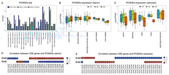 Both VdCreA and VdCreC influence the expression of fungal cell wall-degrading enzyme genes depending on different carbon sources. (A) Bar graph illustrating the statistics of 22 PCWDE gene families. The x-axis represents the gene family names, and the corresponding bars indicate the total number of PCWDE genes in each family and the number of differentially expressed genes under starch conditions and under cellulose conditions. (B) Box plots depicting the expression levels of PCWDE genes under starch conditions. All expression levels were normalized by taking logarithms. Different colors represent samples from different groups, and the median expression level is depicted by a black solid line within each box plot. (C) Box plots illustrating the expression levels of PCWDE genes under cellulose conditions, with normalization by logarithm. Similar to (B), different colors denote samples from different groups, and the median expression level is indicated by a black solid line within each box plot. (D) Heat map depicting the correlation between VdCre genes and PCWDE genes under starch conditions. All correlation coefficients are greater than 80% with a p value less than 0.05. Negative correlations are represented in blue, while positive correlations are shown in red. Larger circles in the heat map indicate higher correlation values. (E) Heat map representing the correlation between VdCre genes and PCWDE genes under cellulose conditions. Similar to (D), all correlation coefficients exceed 80% with a p value less than 0.05. Negative correlations are depicted in blue, and positive correlations are displayed in red. Larger circles in the heat map signify higher correlation values.