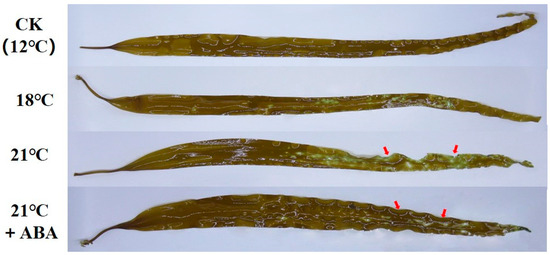 Effect of ABA on physiological morphology of S. japonica under high-temperature stress. The red arrows highlight the most significant portions of the change.