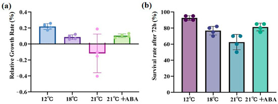 Effect of ABA on physiological characterization of S. japonica under high-temperature stress. (a) Relative growth rate, (b) Survival rate. Data are expressed as means ± standard deviations (SD). The colored dots represent data points for n = 4.