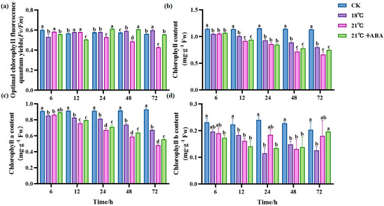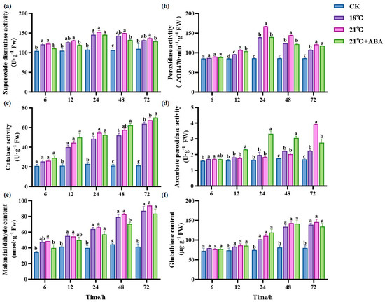 The Pro content remained stable and relatively low in the CK group (Figure 6a). At all time points, the Pro content was significantly higher in the treated group than in the CK group and slightly decreased after 48 h. At 6 h and 48 h, the difference in Pro content was significant between the groups at 18 °C and 21 °C and between 21 °C and 21 °C +ABA. Compared to the CK group, the Pro content at 48 h increased by 168.51% and 213.7% in the 18 °C and 21 °C groups, respectively, and decreased by 6.76% with the addition of ABA compared to the no-addition variation.