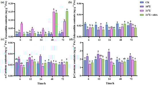 Effect of ABA on carotenoid content of S. japonica under high-temperature stress. (a) Zeaxanthin, (b) Violaxanthin, (c) α-carotene, (d) β-carotene. Data are expressed as means ± standard deviations (SD). According to Duncan’s multiple range test, different letters indicate significant differences between the means of different treatments at the same time point (p < 0.05).