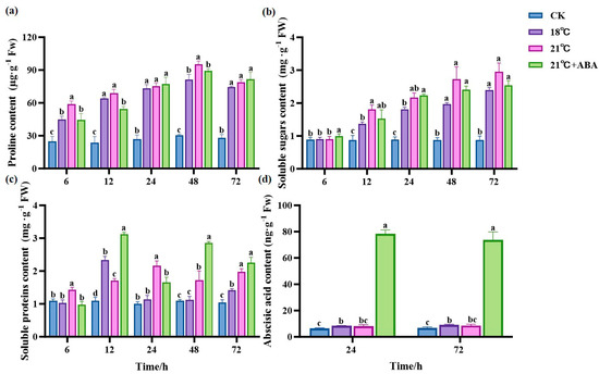 There was no significant change in the soluble protein (SP) content in the CK group (Figure 6c). The trends of the SP content varied greatly among treatment groups. The SP content in the 18 °C group first increased, then decreased, and then increased again, reaching a maximum value of 2.34 mg·g−1 Fw at 12 h, which was 78.69% higher than CK. The 21 °C group showed a similar trend to the 18 °C group but reached a maximum at 24 h. The 21 °C +ABA group showed a jagged change and reached a maximum value of 3.12 mg·g−1 Fw at 12 h, which increased by 82.46% compared to 21 °C, while the SP content was significantly different from the 21 °C group before 48 h of cultivation.