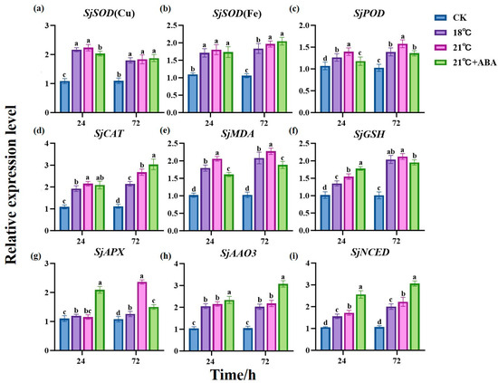 The results showed that the expression of antioxidant enzyme-related genes was significantly up-regulated in all treated groups compared to the CK group. At 24 h, the expression of the four genes, SjPOD, SjCAT, SjMDA, and SjGSH, differed significantly between the 18 °C and 21 °C groups, with the 21 °C group being up-regulated by 10.38%, 11.57%, 14.89%, and 14.41%, respectively, compared to the 18 °C condition. The expression differences between the SjSOD (Cu), SjPOD, SjMDA, SjGSH, and SjAPX genes in the 21 °C and 21 °C +ABA groups were significant, in which SjSOD (Cu), SjPOD, and SjMDA were up-regulated by 10.04%, 18.56%, and 28.18% in the 21 °C group compared to the 21 °C +ABA group, respectively, while SjGSH and SjAPX were down-regulated by 15.16% and 81.61%, respectively. At 72 h, compared with the 18 °C group, the 21 °C group up-regulated SjSOD (Fe), SjPOD, SjCAT, SjMDA, and SjAPX by 6.95%, 13.38%, 25.01%, 9.24%, and 87.85% respectively. SjPOD, SjMDA, SjGSH, and SjAPX were down-regulated by 15.95%, 20.83%, 8.7%, and 57.52%, while SjCAT was up-regulated by 13.29% in the 21 °C +ABA group compared to the 21 °C group.