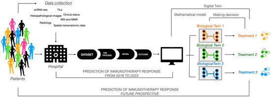 In healthcare, a DT can be a virtual replica of a particular patient, or part of a patient, and thus reflects the patient’s unique genetic or tissue microenvironment composition, or it can be a simulated 3D model showing a patient’s physiological characteristics [3]. Ideally, the development of DTs aims to offer personalized healthcare to individual patients, such as in relation to their response to immunotherapy.