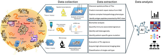 To further enhance the effectiveness of ICIs, understanding the tumor microenvironment, including factors such as tumor-infiltrating lymphocytes (TILs) and tertiary lymphoid structures (TLSs), is crucial. For this reason, it is necessary to integrate information from histopathological features, imaging omics features, genomics, and scRNA-seqs of the immune system (this approach is commonly used in AI analysis, as described in Section 4). Understanding the tumor microenvironment also involves evaluating the density of tumor-infiltrating lymphocytes (TILs) within the tumor, which is regarded as a potential predictor of ICI response. Indeed, TIL density is a powerful positive prognostic indicator for some tumor types, despite ICI therapy. Indeed, a parameter called Immunoscore, which predicts the quantification of CD8+ T cells in the center and periphery of a tumor, is a strong predictor of overall survival that can complement traditional tumor–node–metastasis staging or microsatellite instability (MSI) status in colorectal cancer (CRC) [24,25]. In particular, single-cell sequencing demonstrated that CD4+ memory T cells are also enriched in ICI 180-responsive human melanomas. In the context of anti-PD1 therapy, TIL density measured by immunohistochemical (IHC) tests at the invasive margin of a tumor, relative to central infiltration, has been reported to be strongly associated with anti-PD1 response. We therefore find ourselves in the field of omics data, whose degree of complexity requires AI tools for their analysis [26] (Figure 2).