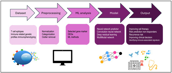 Figure 3. A step-by-step illustration of the application of AI methodologies employed, and how they integrate with immune-associated signatures and impact patient outcomes. AI neural networks can be used to predict immune responses by simulating immune reactions to tumors. This leads to better clinical decisions, such as the use of antibodies and immune checkpoints (like PD-1/PD-L1), or to preventing the recurrence of the disease. Characterizing the patient’s immune signature through AI allows for the development of new antibody therapies. Machine learning (ML); differentially expressed genes (DEGs).