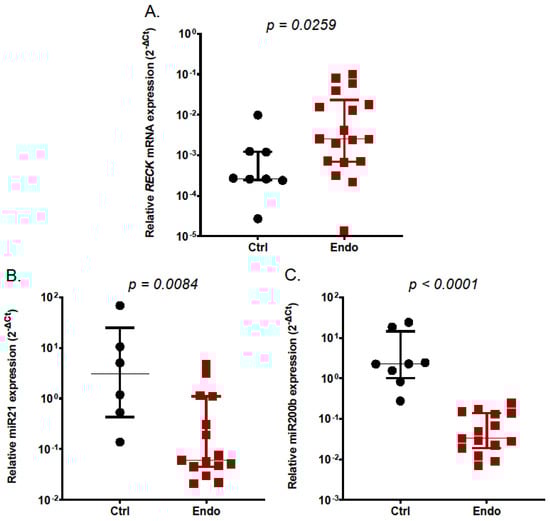Expression of RECK mRNA (A), miR21 (B), and miR200b (C) in the endometrium from control subjects (Ctrl, n = 8) and ectopic endometriotic lesions (Endo, n = 14) in the luteal phase of the menstrual cycle. Expression of genes of interest was determined with qRT-PCR. Data are shown as scatterplots with the median and interquartile range. Statistical differences between groups were computed by the Mann–Whitney U-test.