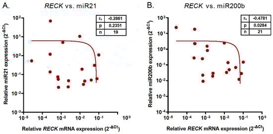 These observations prompted us to investigate if there was any correlation between RECK mRNA and miR21 or miR200b levels. A Spearman correlation analysis revealed that the expression of RECK and miR200b genes was significantly inversely correlated (rs = −0.4781, p = 0.0284, Figure 2A). There was no significant correlation between miR21 and RECK levels (rs = −0.2861, p = 0.2351, Figure 2B).