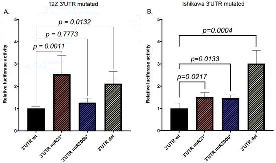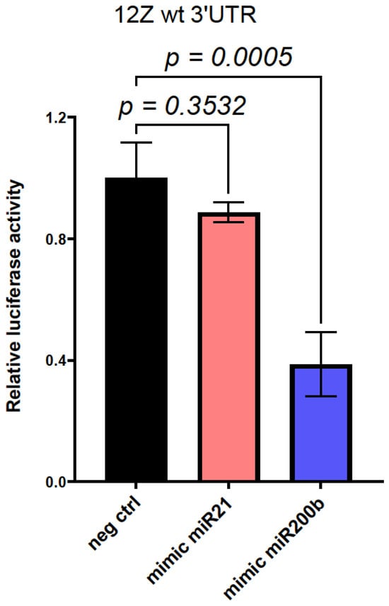 To verify whether miR200b and miR21 MREs in RECK-3′UTR are active in cells of endometrial origin, a construct carrying the luciferase gene fused with RECK-3′UTR and controlled by CMV promoter was generated as described in detail in the Section 4. The resulting RECK-3′UTR-PMIR plasmid was introduced into the endometriotic cell line 12Z together with particles mimicking miR200b and miR21 (microRNA mimics). As shown in Figure 3, the introduction of the miR200b mimic strongly reduced the activity of RECK-3′UTR in the endometriotic 12Z cell line, whereas the co-expression of miR21 mimics did not affect RECK-3′UTR activity.