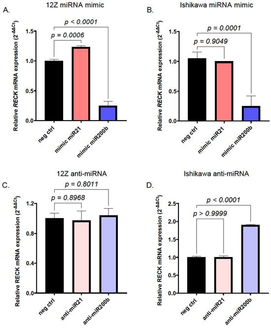 Effect of miR200b and miR21 on expression of endogenous RECK gene. Effect of transfection with miR200b or miR21 mimic oligonucleotides on RECK mRNA in 12Z (A) and Ishikawa (B) cells. Effect of transfection with anti-miR200b and anti-miR21 oligonucleotides on RECK mRNA in 12Z (C) and Ishikawa (D) cells. Effect of miR overexpression or inhibition on relative RECK mRNA expression was determined with qRT-PCR. Data are expressed as fold of control, e.g., RECK mRNA level in cells transfected with negative control for miR mimic or anti-miR particles, respectively. Graphs present mean values ± SD obtained in 3 independent experiments. One-way ANOVA with Tukey’s post-analysis test was used to evaluate the statistical significance of the results.