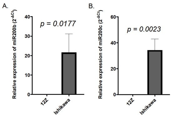 To uncover the reason for the observed difference between the data obtained in 12Z and Ishikawa cell lines regarding the effect of mimic and anti-miR particles, the basal levels of the two miR200 transcripts, i.e., miR200b and miR200c, were compared in both investigated cell lines. The measurement revealed that the level of miR200b was almost 200 times higher in the Ishikawa cell line than in 12Z cells (the 2−ΔCt value was 21.61 ± 9.57 and 0.11 ± 0.057 for Ishikawa cells and 12Z cells, respectively, Figure 6A). The level of miR200c in Ishikawa cells exceeded that detected in 12Z cells more than 1000-fold (the 2−ΔCt value was 34.29 ± 8.6 and 0.02 ± 0.01 for Ishikawa cells and 12Z cells, respectively, Figure 6B).