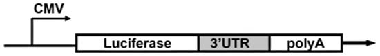 The 3′UTR of the RECK gene was cloned from the gDNA of a healthy volunteer. In brief, the 3′UTR RECK sequence (ENSG00000122707) was amplified by PCR using Qiagene Hot Start Plus polymerase (Promega Corp.) with sense 5′-TCTGAGCTCATCATTTCCCAGGTACAG-3′ and antisense 5′-GCAGCGGCCGCAGCTCACCTAAGGG-3′ primers containing SacI and NotI restriction sites, respectively. The resulting 1621bp long amplicon was cloned into a pJet 1.2 vector using the CloneJET PCR Cloning Kit (Fermentas Inc., Glen Burnie, MD, USA) according to the manufacturer protocol. Minipreps from positive clones were digested with SacI and NotI restriction enzymes; the released inserts were isolated from agarose gel, purified, and subcloned into the pMIRreport vector, developed to evaluate the activity of UTRs derived from genes of interest (Ambion, Austin, TX, USA). The resulting colonies were screened by PCR to select clones displaying the correct insert orientation. The thereby obtained RECK-3′UTR-pMIR construct of 7970bp length was purified and sequenced. The resulting construct carried the luciferase coding sequence under the control of CMV promoter and RECK 3′UTR (Figure 7).