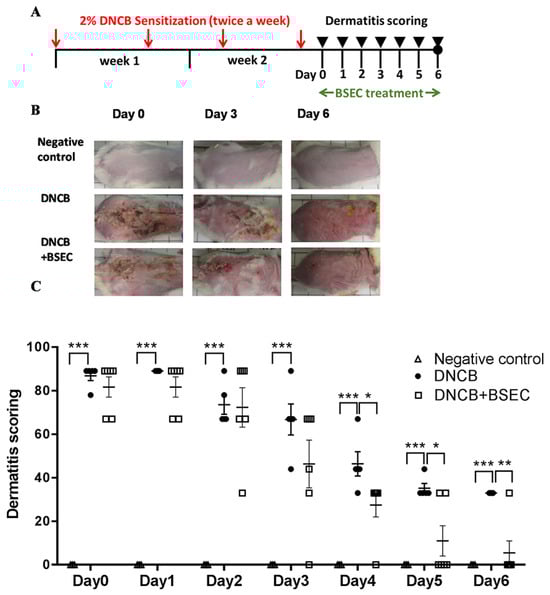 Our research was conducted in accordance with internationally accepted principles for laboratory animal use and care. These animal studies were reviewed and approved by the Institutional Animal Care and Use Committee (IACUC) of Kaohsiung Medical University (IACUC Approval No. 102043). Six-week-old male pathogen-free BALB/c mice were purchased from the National Laboratory Animal Center (Taipei City, Taiwan) and maintained under controlled temperature (25 ± 1 °C) and humidity (60 ± 5%) with a 12 h light/12 h dark cycle. Three mice were housed together per cage with free access to water and chow and were then divided into three groups as follows: negative control group (N = 3), DNCB group (N = 6), and DNCB group with BSEC treatment (N = 6). The images in Figure 1 show that the skin of the negative control group remained in a normal state, clearly different from the pathological changes observed in the DNCB group. Hence, three mice were sufficient to represent the negative control. Additionally, this approach aligns with ethical considerations to reduce animal usage. For dermatitis induction, all mice had 100 μL of 2% DNCB applied on the hair-shaved back twice a week for two weeks prior to BSEC treatment. BSEC was then applied to the sensitized skin at the dose of 0.5 g every day from day 0 to day 6. The negative control group was treated with acetone and olive oil at a 4:1 ratio (the solvent of DNCB).