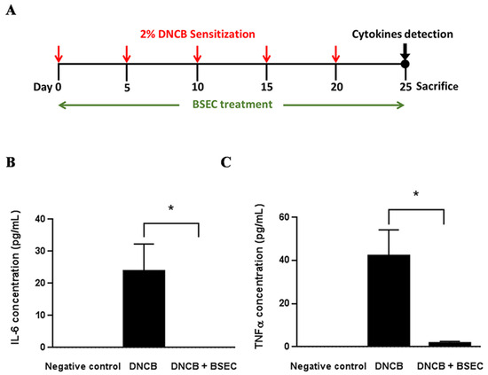 Furthermore, we examined the level of inflammatory cytokines, including IL-6 and TNF-α, in the DNCB-induced dermatitis animal model. Figure 2A is the schematic diagram of the study design. The skins of the mice were sensitized with DNCB every 5 days for five times starting from day 0. Mice in the DNCB + BSEC group were treated with BSEC daily from day 0 to day 25. ELISA results showed that DNCB-mediated skin sensitization dramatically increased IL-6 levels in the skin tissues compared to the negative control group (Figure 2B); however, the increase in IL-6 was significantly suppressed by BSEC treatment. TNF-α results showed a similar trend as well (Figure 2C).