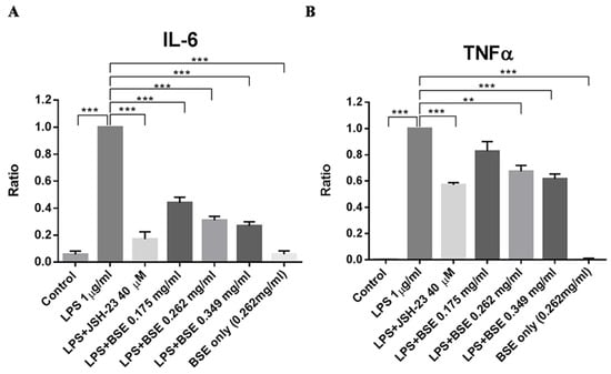 BSEL significantly repressed LPS-elicited cytokine release in vitro, (A) IL-6, and (B) TNF-α from PMA-differentiated THP-1 macrophages. JSH-23 is an inflammation inhibitor. It inhibits NF-κB transcriptional activity. To obtain the ratio, the concentration (pg/mL) of each cytokine was divided by the concentration of the same cytokine in the LPS group. Ratios were presented as mean ± S.E.M. ** p < 0.01; *** p < 0.001 when compared with the LPS-treated group by Student’s unpaired t-test. Abbreviations: BSE, black soybean exact; LPS, lipopolysaccharide.