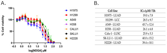 To evaluate the antitumor role of NDGA, the H1975, H1299, A549, H358, Calu-1, SK-LU-1, and H2228 lung cancer cell lines (NSCLC) were treated with increasing concentrations of NDGA for 72 h. As shown in Figure 1, the NDGA exposure decreased the cell survival of the seven cell lines, where H1975, H358, and Calu-1 cells were the most sensitive, and A549, SKLU-1, and H2228 cells were the most resistant cell lines to NDGA treatment, with a calculated IC50 value between 15–25 and 30–45 µM, respectively. Interestingly, NDGA concentrations over 100 µM reduce cell viability by almost 100% in all cell lines.