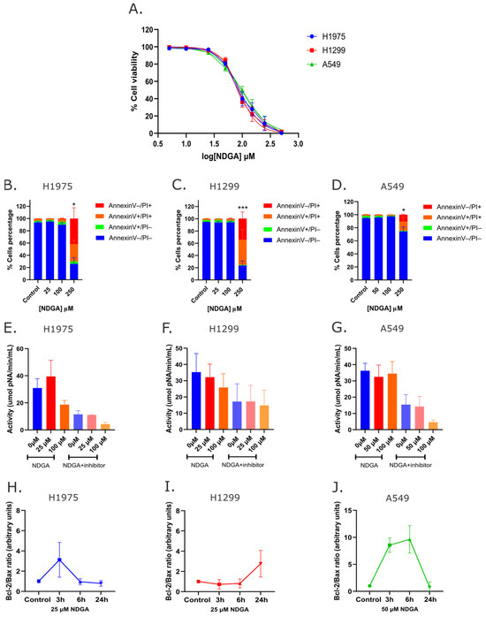 NDGA induces cell death in NSCLC cells. (A) H1975, H1299, and A549 cells were treated with different concentrations of NDGA for 24 h, and the effect on cell viability was measured by propidium iodide staining. Graphs represent the mean of three experiments performed in triplicate. (B–D) H1975, H1299, and A549 cells were treated with different concentrations of NDGA (0, IC50, 100, and 250 µM) for 24 h, and the percentage of annexin V+/− or PI+/− cells was evaluated by flow cytometry and graphed. (E–G) After 24 h of treatment with NDGA, cells were collected by centrifugation, and caspase-3 activity was analyzed according to the kit manufacturer’s instructions. The inhibitor was included in the kit. (H–J) Cells were treated with the corresponding IC50 values for each cell line for 3 h, 6 h, or 24 h, and then RNA was extracted. The gene expression of Bcl-2 and Bax was evaluated using RT-qPCR assays. Actin was used as a housekeeping gene, and culture media was used as a vehicle. Data are presented as mean ± SEM of 3 independent experiments. Statistical analysis was performed using two-way ANOVA for flow cytometry assays. p-values are * p < 0.05 and *** p < 0.001.