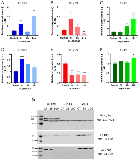 Since NDGA seems to induce non-apoptotic cell death, some hallmarks associated with pyroptosis were analyzed because the rupture of the plasma membrane characterizes this cell death type, and the cell also became permeable to propidium iodide (PI) [25]. The cells were treated with the IC50 of NDGA for 3 h, 6 h, and 24 h to analyze the gene expression of proinflammatory cytokines, IL-1b and IL-18, which are increased in the presence of pyroptosis cell death. An increase in the expression of IL-1b was observed (Figure 3A–C) in H1975 and A549 cell lines after 24 h of treatment. In the case of H1299, there is a non-significant increase after 3 h of treatment, with a reduction after 24 h of treatment. Analyzing the expression of IL-18 (Figure 3D–F), the results showed an increase after 3 h of treatment with NDGA in the H1975 cell line and a slight increase after 24 h of treatment in the A549 cell line. Like IL-1b, in H1299 cell lines, NDGA induces a decrease in the expression of IL-18 at all treatment times analyzed. One of the most important hallmarks of pyroptosis is the proteolytic fragmentation of gasdermin, specifically gasdermin E (GSDME) and gasdermin D (GSDMD). The levels of GSDME and GSDMD were analyzed, along with their fragmentation, in response to NDGA treatment using two different concentrations. Fragmentation of these proteins could not be observed, although changes in protein levels were evident. In Figure 3G, the results show a decrease in GSDME levels in H1299 and A549 cell lines, with no differences in H1975. However, for GSDMD, there is a decrease only in the H1975 cell line. This protein was not observed in the H1299 cell line, and we can see an increase in the levels of GSDMD in A549 after NDGA treatment.