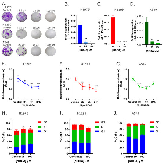 NDGA inhibits cell proliferation of NSCLC cells. (A) H1975, H1299, and A549 cells were treated with different concentrations of NDGA for 24 h. After 10 days, the colony-forming assay was performed. (B–D) The cell lines were treated with 25, 50, or 100 µM NDGA for 24 h, and cell proliferation was measured by the relative incorporation of BrdU. (E–G) Cells were treated for 3 h, 6 h, and 24 h, and then the effect on ki-67 gene expression was evaluated with RT-qPCR assays. Actin was used as a housekeeping gene, and media was used as a vehicle. Data are presented as means ± SD. (H–J) The cells were treated for 24 h with IC50 and 100 µM NDGA, collected, and stained with PI for cell cycle analysis by flow cytometry. p-values are determined by one-way ANOVA compared to the control * p < 0.05, ** p < 0.01 and *** p < 0.001.