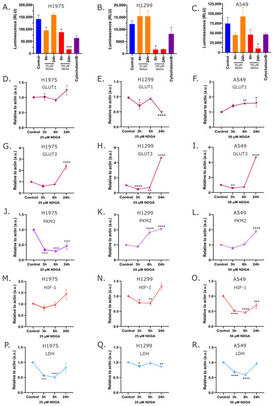 NDGA impacts glucose uptake and metabolic enzymes. (A–C) H1975, H1299, and A549 cells were treated with IC50 values and 100 µM of NDGA for 6 h and 24 h. The intracellular accumulation of 2-deoxy-glucose-6-phosphate was measured by luminescence. Cytochalasin B (50 µM) was used as a glucose transport inhibitor control. (D–R) H1975, H1299, and A549 cells were treated during 3, 6, and 24 h with IC50 values of NDGA, and then RNA was extracted and used to evaluate the levels of GLUT1 (D–F), GLUT3 (G–I), PKM2 (J–L), HIF-1 (M–O), and LDH (P–R). Actin was used as a housekeeping gene, and DMSO (or media) was used as a vehicle. Data are presented as means ± SD. p-values were determined by one-way ANOVA compared to the control * p < 0.05, ** p < 0.01, *** p < 0.001, and **** p < 0.0001.