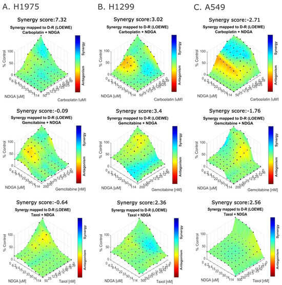 Some advantages of the use of natural products are that they generally are multi-target drugs and have less toxicity [27], which has led to the study of the combination of these compounds together with chemotherapeutics that are currently used for cancer treatment. Given that there is evidence showing a possible synergistic interaction of NDGA with paclitaxel (also known as taxol), the potential of NDGA to act as an activity enhancer of three chemotherapeutics, carboplatin, gemcitabine, and taxol, was evaluated for lung cancer treatment. To analyze this, H1975, H1299, and A549 cells were treated with NDGA in combination with the chemotherapeutic drugs for 72 h, and cell viability was evaluated by MTT assays, and the results were analyzed in Combenefit software [28,29]. As shown in Figure 6A–C, the combination of NDGA and carboplatin shows a synergic interaction pattern in H1975 and H1299 cell lines, the combination of NDGA and gemcitabine shows synergic interaction only in H1299 cells, and the treatment of NDGA plus taxol shows synergic interaction in H1299 and A549 cells, based on the global score SUM_SYN_ANT_WEIGHTED (considering both antagonistic and synergistic effects) that is calculated using Combenefit software. Interestingly, the combination of NDGA with these three chemotherapeutics drugs shows synergistic interactions in the H1299 cell line between low concentrations of the chemotherapeutics and median concentrations of NDGA. Moreover, the combination with the highest synergy score corresponds to the combination of NDGA and carboplatin in the H1975 cell line, where the synergy pattern occurs between low concentrations of NDGA and carboplatin.