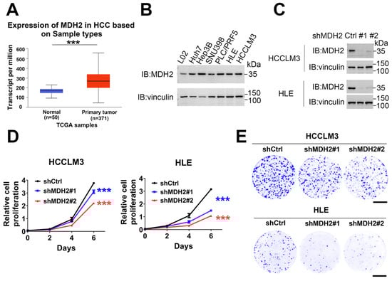 MDH2 promotes HCC cell proliferation. (A) Expression of MDH2 in normal liver tissues and primary HCC tissues obtained from UALCAN. (B,C) MDH2 protein levels were detected by WB, with vinculin as a loading control. (D) Cell proliferation assays were performed in control (shCtrl) and MDH2 knockdown (shMDH2#1 and shMDH2#2) HCC cells (3000 cells/well) for the indicated periods. Cells were stained with crystal violet, followed by dissolving with 10% glacial acetic acid, and absorbance at 595 nm was measured and calculated. (E) Indicated cells were seeded in the 6-well plate (500 cells/well), cultured for a few days (HCCLM3 cells for 10 days; HLE cells for 7 days), and then stained with crystal violet and photographed. Scale bar = 10 mm. (D) Data are represented as the mean ± standard deviation (SD) (n = 3); *** p < 0.0001 (two-way ANOVA). Abbreviations: Ctrl: control. HCC: hepatocellular carcinoma. MDH2: malate dehydrogenase 2. TCGA: The Cancer Genome Atlas Program.