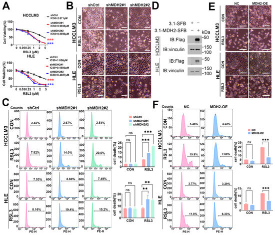 Recent studies have revealed that the downregulation of MDH2 may contribute to the promotion of muscle ferroptosis in sarcopenia [34]. However, the relationship between MDH2 and ferroptosis in HCC remains to be explored. To investigate whether MDH2 plays a regulatory role in HCC ferroptosis, we treated HCC cells with different doses of the ferroptosis inducer RSL3, and the cell viability assays using cell counting kit-8 (CCK-8) reveal that the knockdown of MDH2 resisted RSL3-induced HCC cell viability (Figure 2A). Moreover, compared with wild-type (WT) HCC cells, MDH2-knockdown HCC cells had reduced cell adhesion, and more floating and dead cells were observed by microscopy after RSL3 treatment (Figure 2B). To further test whether MDH2 plays a pivotal role in RSL3-induced cell death, we next analyzed the proportion of cell death by propidium iodide (PI) staining, using flow cytometry. Figure 2C shows that the knockdown of MDH2 significantly promoted RSL3-induced HCCLM3 and HLE cell death. Additionally, to validate this finding, we stably overexpressed MDH2 in HCC cells (Figure 2D) and found that MDH2 overexpression impeded RSL3-induced HCC cell death (Figure 2E,F). Taken together, these findings demonstrate that MDH2 plays an inhibitory role in RSL3-induced cell death in HCC and that the knockdown of MDH2 increases the sensitivity of HCC to RSL3.