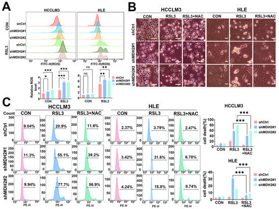 ROS-mediated lipid peroxidation is the central process underlying ferroptosis. During lipid peroxidation, ROS oxidize phospholipids, enzymes, and membrane receptors, as well as macromolecules like polyunsaturated fatty acid side chains and nucleic acids within the biological membranes, leading to the formation of lipid peroxides. These alterations disrupt the fluidity and permeability of the cell membrane, ultimately culminating in cell death [38]. Thus, assessing intracellular ROS content serves as an indicator of the extent of ferroptotic cell death. Next, we aimed to elucidate whether the knockdown of MDH2 enhances RSL3-induced HCC cell death through the upregulation of ROS. We employed a dichlorodihydrofluorescein diacetate (DCFH-DA) probe to monitor intracellular ROS levels and found that, compared with WT HCC cells, MDH2 knockdown cells significantly increased intracellular ROS levels upon RSL3 treatment (Figure 3A). Furthermore, we wondered whether the upregulated intracellular ROS levels in MDH2-knockdown cells induced by RSL3 are the key to HCC cell fate determination. We treated HCC cells with or without the ROS scavenger N-acetyl-L-cysteine (NAC), and the results showed that NAC significantly impeded RSL3-induced cell death in MDH2 knockdown HCC cells (Figure 3B,C). These results suggest that the knockdown of MDH2 enhances the susceptibility of HCC cells to RSL3-induced cell death through the upregulation of ROS, underscoring the critical role of MDH2 in preserving redox homeostasis and safeguarding HCC cells against oxidative stress and the cytotoxic effects induced by RSL3.