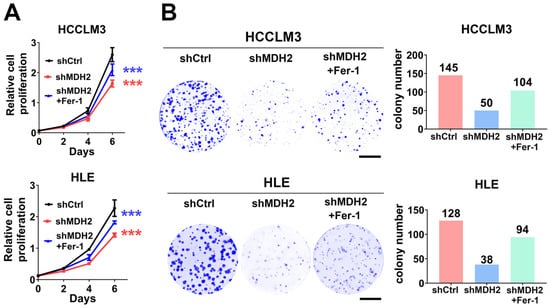 Knockdown of MDH2 inhibits HCC cell growth partially dependent on ferroptosis induction. (A) Cell proliferation assays were performed on control (shCtrl) and MDH2 knockdown (shMDH2#1 and shMDH2#2) HCC cells (3000 cells/well) with or without 0.5 μM Fer-1 for the indicated periods. Cells were stained with crystal violet, followed by dissolving with 10% glacial acetic acid, and absorbance at 595 nm was measured and calculated. (B) Control (shCtrl) and MDH2 knockdown (shMDH2#1 and shMDH2#2) HCC cells were seeded in the 6-well plate (500 cells/well) and cultured with or without 0.5 μM Fer-1 treatment for 10 days and then stained with crystal violet and photographed (left); the colony number was calculated and is shown (right). Scale bar = 10 mm. (A) Data are represented as the mean ± SD (n = 3); *** p < 0.001 (two-way ANOVA). Abbreviations: Ctrl: control. Fer-1: ferrostatin-1. MDH2: malate dehydrogenase 2.