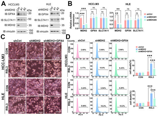 MDH2 induces ferroptosis via GPX4. (A) GPX4, SLC7A11, MDH2, and vinculin protein levels in control (Ctrl) and MDH2-knockdown (#1 and #2) HCC cells were assessed by WB. (B) MDH2, GPX4, and SLC7A11 mRNA levels in control (shCtrl) and MDH2-knockdown (shMDH2#1 and shMDH2#2) HCC cells were determined by RT-qPCR. (C) Control (shCtrl) and MDH2 knockdown (shMDH2) HCC cells with or without GPX4 overexpression were treated with or without 5 μM RSL3 for 24 h and photographed; the representative images are shown. Scale bar = 100 μm. (D) Control (shCtrl) and MDH2 knockdown (shMDH2) HCC cells with or without GPX4 overexpression treated with or without 5 μM RSL3 for 24 h were collected for PI staining and assayed by flow cytometry ((D), Left). Cell death rates were calculated and are shown in bar graph ((D), Right). (B,D) Data are represented as the mean ± SD (n = 3); ns = no significance, ** p < 0.01, and *** p < 0.001 (one-way ANOVA for (B,D)). Abbreviations: CON: control. Ctrl: control. GPX4: glutathione peroxidase 4. MDH2: malate dehydrogenase 2. PE-H: phycoerythrin-height. SLC7A11: solute carrier family 7 member 11. RSL3: RAS-selective lethal 3.