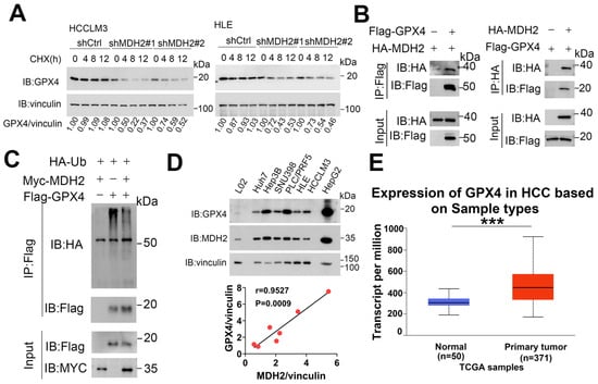 Protein expression can be regulated at post-transcriptional and post-translational levels. To examine the specific molecular mechanism of MDH2 in the regulating GPX4 protein level, we treated HCCLM3 and HLE cells with protein synthesis inhibitor cycloheximide (CHX) at different time points. Our WB analysis revealed that MDH2 knockdown significantly accelerated GPX4 degradation (Figure 7A), suggesting that MDH2 knockdown may decrease the expression level of GPX4 protein by inhibiting its stability. Co-immunoprecipitation (CO-IP) assays revealed the interaction between MDH2 and GPX4 (Figure 7B). Protein poly-ubiquitination is the signal to mediate protein degradation [51]; to corroborate these results, we immunoprecipitated exogenously overexpressed GPX4 and found that the overexpression of MDH2 inhibited the poly-ubiquitination level of GPX4 (Figure 7C), implying that MDH2 may enhance the stability of GPX4 by inhibiting its ubiquitination-mediated degradation. Furthermore, GPX4 protein levels were also higher in a panel of HCC cell lines (Huh7, Hep3B, SNU398, PLC/PRF5, HepG2, HCCLM3 and HLE) than in normal hepatocytes L02 cells (Figure 7C). It is noteworthy that the Pearson correlation analysis revealed a positive correlation between the expression levels of GPX4 and MDH2 in HCC cells (Figure 7D), indicating a potential functional relationship between these two proteins in HCC. To explore the functional significance of GPX4 in HCC, we analyzed the GPX4 expression in the UALCAN website and found that GPX4 expression was upregulated in tumor tissue samples from HCC patients compared with normal control tissue (Figure 7E).