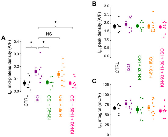 The effect of ß-adrenergic stimulation on IK1 and the suppressibility of this effect by CaMKII inhibition (KN-93) and PKA inhibition (H-89). Data obtained in 5 groups of myocytes are compared: untreated control (CTRL; n = 7/5), ß-adrenergic stimulation alone (ISO; n = 7/6), ß-adrenergic stimulation following CaMKII inhibition (KN-93 + ISO; n = 7/6), ß-adrenergic stimulation following PKA inhibition (H-89 + ISO; n = 10/7), and ß-adrenergic stimulation with the inhibition of both kinases (KN-93 + H-89 + ISO; n = 9/7). The “n” numbers in parentheses indicate the number of cells over the number of animals used in that experimental group. (A) Mid-plateau current densities, (B) peak current densities, (C) current integrals. Symbols and bars are mean ± SEM, and small dots represent individual data. Asterisks (*) indicate significant differences (p < 0.05) between groups. NS: not significant.
