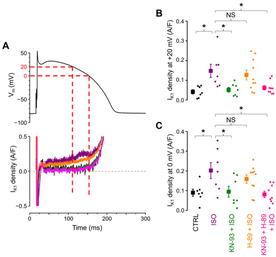 (A) Command action potential (above) and representative enlarged IK1 current traces flowing during the action potential plateau (below). Dashed lines indicate the corresponding voltage and current values at 0 mV and at +20 mV. (B,C) IK1 densities measured at +20 mV and at 0 mV, respectively, in the 5 cell groups of control (CTRL; n = 7/5), ß-adrenergic stimulation alone (ISO; n = 7/6), ß-adrenergic stimulation following CaMKII inhibition (KN-93 + ISO; n = 7/6), ß-adrenergic stimulation following PKA inhibition (H-89 + ISO; n = 10/7), and ß-adrenergic stimulation with the inhibition of both kinases (KN-93 + H-89 + ISO; n = 9/7). The “n” numbers in parentheses indicate the number of cells over the number of animals used in that experimental group. Symbols and bars are mean ± SEM, and small dots represent individual data. Asterisks (*) indicate significant differences (p < 0.05) between groups. NS: not significant.