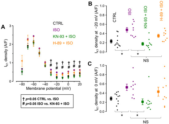 The effects of ISO alone and in the presence of KN-93 and H-89 on the IK1 density under conventional voltage clamp conditions. (A) IK1 densities measured at the end of various test potentials (shown on the abscissa) lasting for 250 ms and rising from the holding potential of −80 mV in the 4 cell groups of control (CTRL; n = 11/3), ß-adrenergic stimulation alone (ISO; n = 9/5), ß-adrenergic stimulation following CaMKII inhibition (KN-93 + ISO; n = 10/3), and ß-adrenergic stimulation following PKA inhibition (H-89 + ISO; n = 9/5). The “n” numbers in parentheses indicate the number of cells over the number of animals used in that experimental group. Detailed statistical analyses of the IK1 densities measured at −20 mV and 0 mV are depicted in panels (B) and (C), respectively. Symbols and bars are mean ± SEM, and small dots represent individual data. On panel (A), daggers (†) and hash signs (#) indicate significant differences (p < 0.05) between the control and ISO groups and between the ISO and KN-93 + ISO groups, respectively. On panels (B,C), asterisks (*) indicate significant differences (p < 0.05) between groups. NS: not significant.