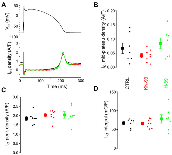 CaMKII inhibition with KN-93 or PKA inhibition with H-89 has no effect on IK1 under baseline conditions. The cell groups of control (CTRL; n = 7/5), CaMKII inhibition (KN-93; n = 8/5), and PKA inhibition (H-89; n = 7/4) were compared. The “n” numbers in parentheses indicate the number of cells over the number of animals used in that experimental group. (A) Command action potential (above) and the corresponding representative IK1 current traces flowing during the action potential (below). (B) Mid-plateau current densities, (C) peak current densities, and (D) current integrals. Symbols and bars are mean ± SEM, and small dots represent individual data. The arithmetic means of the groups were not significantly different in any parameters with one-way ANOVA.