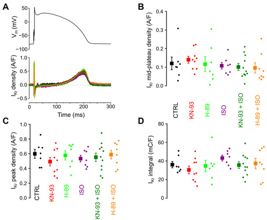 The consequences of KN-93 and H-89 treatment, as well as the effects of ISO in the absence and presence of these inhibitors, were studied on IKr under similar experimental conditions. Neither ISO, nor the inhibitors applied alone or in combination with ISO, modified the profile (Figure 6A), the mid-plateau density (Figure 6B), the peak density (Figure 6C), and the integral (Figure 6D) of IKr.