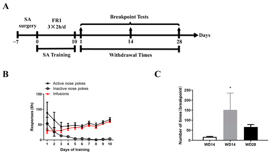 Cocaine-seeking motivation model in rats: (A) Behavioral protocol; (B) Diagram of SA behavioral training in rats (two-way ANOVA followed by Tukey’s multiple comparisons test); (C) Results of the drug seeking motivation test at different times of withdrawal (WD1 is the 1st day of withdrawal; WD14 is the 14th day of withdrawal; WD28 is the 28th day of withdrawal). n = 8 for WD1 group; n = 4 for WD14 group; and n = 6 for WD28 group. * p < 0.05 (WD1 vs. WD14, one-way ANOVA followed by Tukey’s multiple comparisons test).