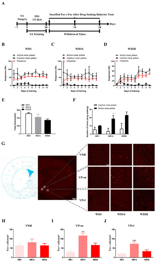 Expression of c-Fos positive cells of the VP subregions at different times during withdrawal. (A) Behavioral protocol; (B–D) WD1, WD14 and WD28 behavioral training diagram (two-way ANOVA followed by Tukey’s multiple comparisons test: (B) sides F(1,80) = 154.189, p < 0.0001; (C) sides F(1,60) = 45.832, p < 0.0001; (D) sides F(1,80) = 96.565, p < 0.0001, days F(1,60) = 2.341, p = 0.025, sides × days F(9,60) = 3.050, p = 0.005); (E) Amount of cocaine used during the entire training period for the three groups of rats (two-way ANOVA followed by Tukey’s multiple comparisons test); (F) Drug-seeking behavioral test results in the three groups of rats, * p < 0.05; (G) Schematic representation of expression levels of c-Fos positive cells in VP subregions; (H–J) Statistical plots of c-Fos activation in different subregions of the VP, *** p < 0.001, **** p < 0.0001 (WD1: n = 5; WD14: n = 4; WD28: n = 4; one-way ANOVA followed by Tukey’s multiple comparisons test).