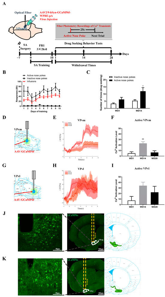 Neuronal activation in the VPvm and VPvl at different times during withdrawal. (A) Behavioral training and fiber photometry protocol; (B) Diagram of behavioral training of rats for fiber photometry (two-way ANOVA followed by Tukey’s multiple comparisons test. sides F(1,220) = 152.8, p < 0.0001); (C) Drug-seeking behavioral test in two groups of rats, * p < 0.05; (D–I) Changes in neuronal calcium activity recorded in the VPvm and VPvl during the nose poking in the active side in the behavioral tests. (D,G) show positions, and (E,H) represent calcium signal changes in the VPvm during nose poking on the active side. The neuronal activation situation was characterized by calcium signaling changes within 5 s after the poking. The recorded data were calcium activity of the neuronal population, and the included data were the calcium signals in each brain side under a stable recording of calcium signal during behavioral tests. (F,I) show quantitative plots of calcium imaging results (one-way ANOVA followed by Tukey’s multiple comparisons test: (F) days F(2,11) = 7.668, p < 0.01; ** p < 0.01); (J,K) Schematic diagram of the optical fiber and virus diffusion. VPvm (J), VPvl (K). (The number of animals tested was 12, and bilateral brain regions per animal, 24 calcium signal data in total, while stable recordings were included in the analysis: n = 10–11, * p < 0.05, ** p < 0.01, one-way ANOVA followed by Tukey’s multiple comparisons test).